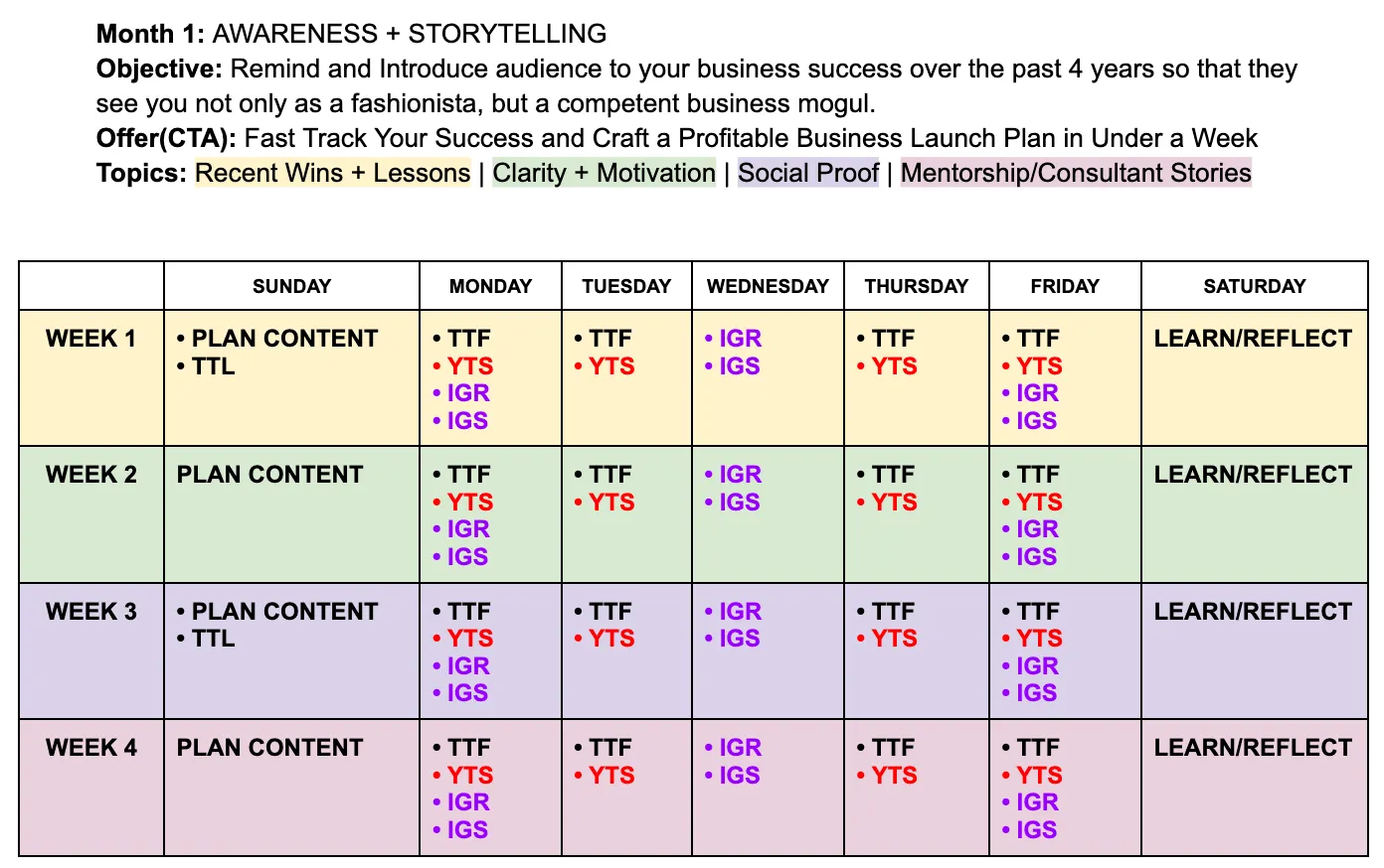 If you analyze the graphic above, you will see the theme for the month followed by the objective. Then, there is a specific call to action for the month that is broken down into weekly topics. These weekly sprints of content are meant to cognitively shepherd the audience exactly where I want them to go.